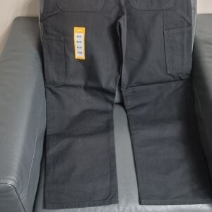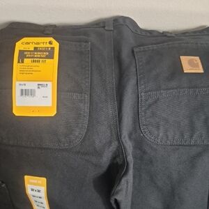 Durable Carhartt pants with loose fit. Features tool and utility pockets. Comfortable and practical design.