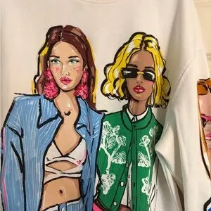White sweatshirt featuring vibrant graphic design. Stylish and trendy.