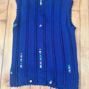 Artisan Handmade Navy Blue Knit Vest with Multicolor Buttons & Floral Details