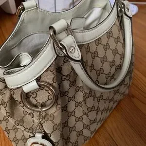 Chic Gucci shoulder bag in beige GG canvas. Features elegant leather trim and iconic logo charm. Ideal for stylish outings.