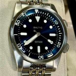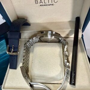 Baltic Aquascaphe Duel Crown Black Dial Classic Luxury Men’s Watch. 39mm DUA11BLUS12 Automatic. Silver Smooth Fixed Bezel, Scratch Resistant Sapphire Crystal, Blue Dial, Dual Rotating Crown, Stainless Steel Case, Rice Bead Bracelet, and Locking Folding Clasp. WR TO 200 meters.