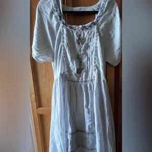 Free People dreamy lightweight layered pale blue dress with pale blue cotton slip. Bodice loosely fitted at the waist. Skirt full but falls gracefully. Pale blue pinstripe on one part of the layering Open partly in square at the back nicely fitted into top and sleeves.