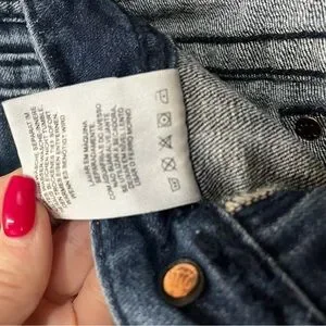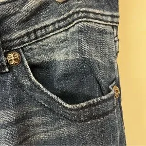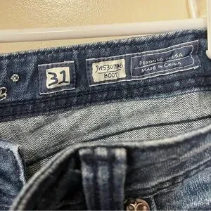Stylish dark blue boot cut jeans. Size 31. Features classic stitching and comfortable fit. Ideal for casual wear. Beautiful rhinestone embellishments on the back pockets. Excellent, gently worn.