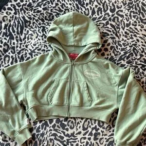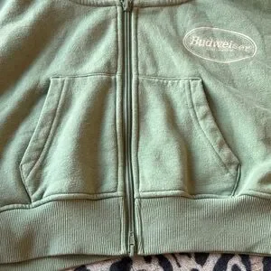 Cropped hoodie with Budweiser logo. Features front pockets and a hood.