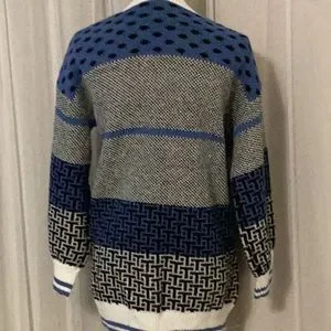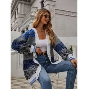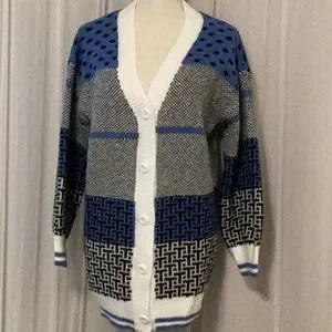Printed Oversized Button Up V-Neck Cardigan Blue White Black Lantern Sleeve