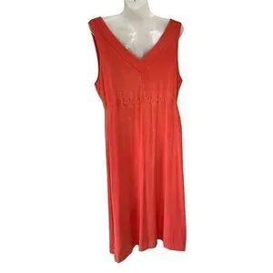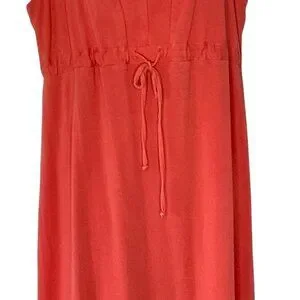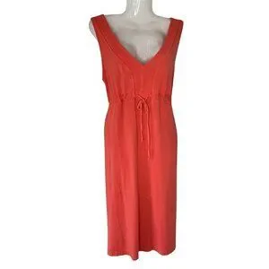 Fresh Produce Sleeveless Stretch Knit Dress Tank Style with V-Neck (front and back) and Drawstring at Waist Cantaloupe Color Knee Length. Summer Beach Travel Vacation Beachy Lightweight Comfortable Casual