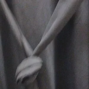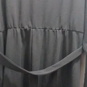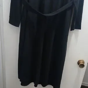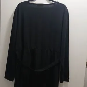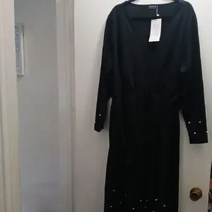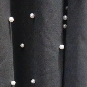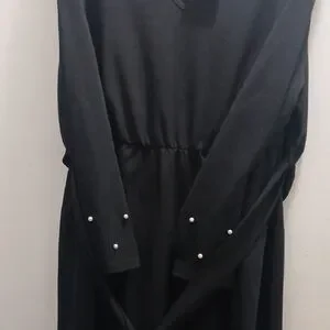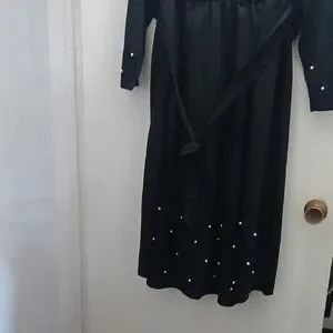Elegant black dress with long sleeves. Features pearl accents on cuffs and hem. Ideal for any occasion.