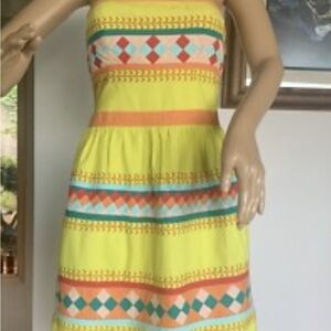 Anthropologie Rare! Strapless vibrant dress with yellow,coral, turquiose and orange geometric embroidery. Perfect for a bold look. Side zipper with pockets
