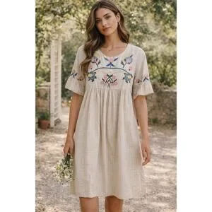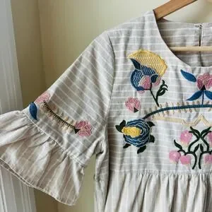 Keywords: Cottagecore, Boho, Prairie, Peasant, Embroidered, Striped, Babydoll, Empire Waist, Ruffle Sleeve, Coastal Grandmother, Natural, Breathable, Summer Dress, Tea N Rose, Floral Embroidery