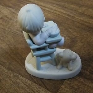 Adorable figurine of a baby in a high chair with a teddy bear. Perfect for nursery decor.
