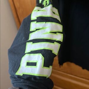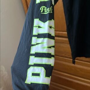 Black tee with neon green lettering. Please see photos that shows cracking on the arm