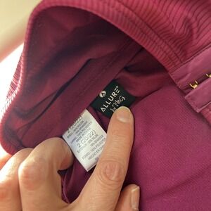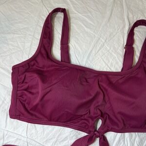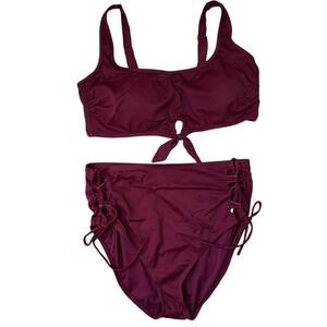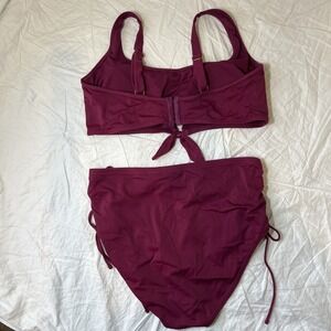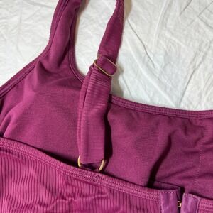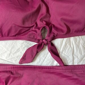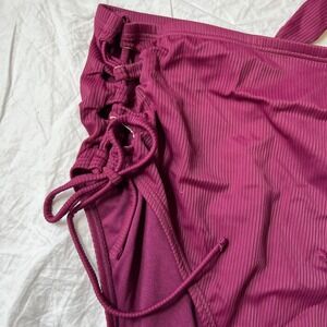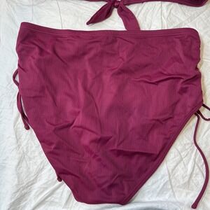 This bikini is in great condition. It's a magenta color with ribbed fabric. The top has adjustable straps and an adjustable band with gold accents. The top also has removable pads. The pads are included. The bottoms are high waisted and have tummy control. The sides of the front have lace up ties to adjust the width of the bottom. There is no pilling or snags on the back of the bottoms. Size 2XL for sizes 20/22.