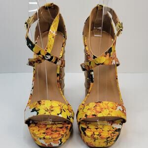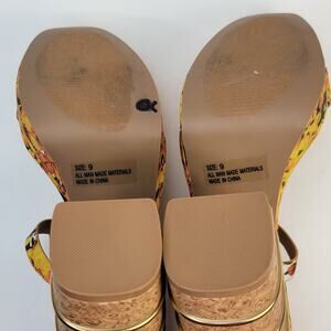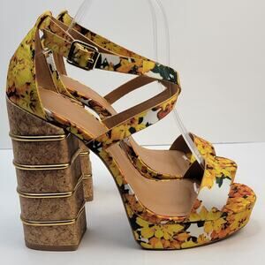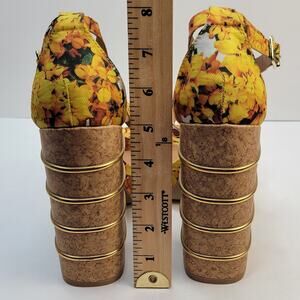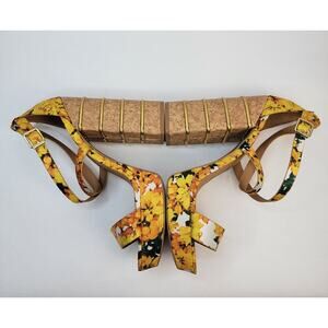 Yellow floral print strappy platform multi-tiered cork block heel accented with gold-toned metal rings.