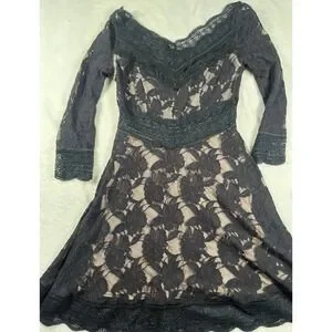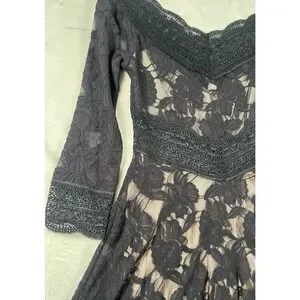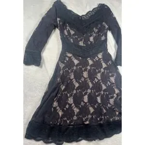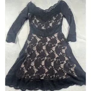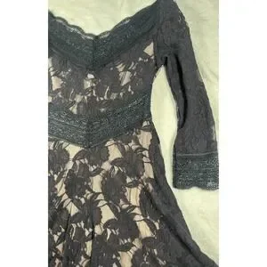 The Free People Lacey Affair Lace Cutout Mini Dress in Black is a stunning and stylish option for a party or formal occasion. Made from a blend of nylon and rayon, the dress features a boat neckline, half sleeves, and an off the shoulder sleeve type. The lace fabric adds a touch of elegance, while the dress length is short and perfect for a mini look. With a pullover closure and layered accents, this dress is sure to make a statement with its bohemian theme and Cinderella character.