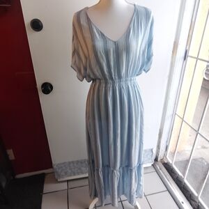 Chic Maxi Small dress with light blue stripes. Features a relaxed fit and v-neckline. Ideal for casual outings.