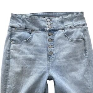 Veronica Beard Katherine Corset-Waist Extra High Rise Skinny Jeans. Jeans are light wash (Glacier Wash) with a high waist button front closure. Jeans are made of a cotton spandex blend and are a woman's size 31/12. Org. list price $278.