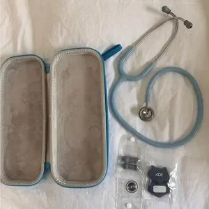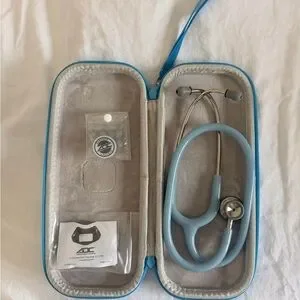 DC stethoscope in light blue. Includes protective zip case and spare accessories in sealed bags. Dual-head chestpiece and soft ear tips for comfortable auscultation. Portable and ready for clinical use.