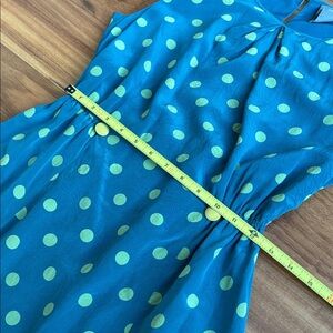 Pretty teal silk Girls from Savoy for Anthropologie sleeveless dress with yellow polka dots. Elasticized waistband with decorative buttons in front. Flattering pleating at the neckline. Great condition.