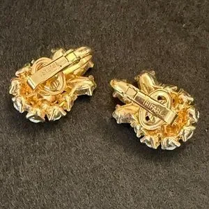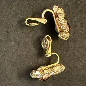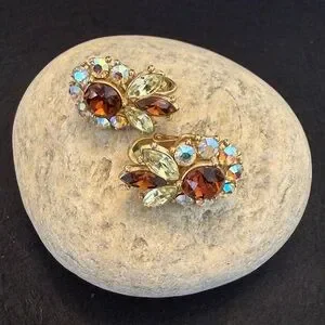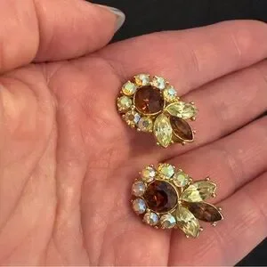 Crown Trifari vintage/mcm floral AB clip-on earrings featuring yellow, bronze, and iridescent rhinestones set in gold-tone metal.