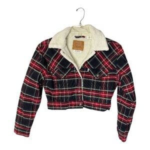 Cozy sherpa jacket with plaid details. Ideal for casual wear.