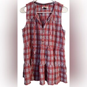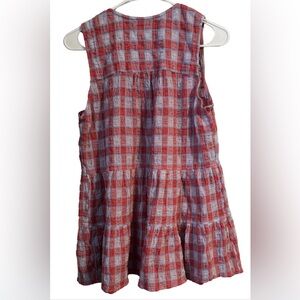 Pilcro by Anthropologie sleeveless plaid top in a red and blue check pattern. Features a flattering V-neckline with button-front detail and a relaxed babydoll silhouette for an easy, feminine fit. Lightweight and breathable, making it perfect for warm weather or effortless layering. A great everyday casual piece that pairs well with jeans, shorts, or skirts. Has light signs of wear due to normal use. No holes, tears, or stains.