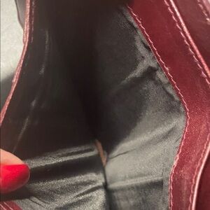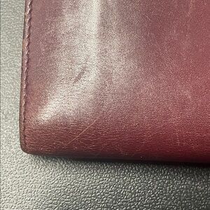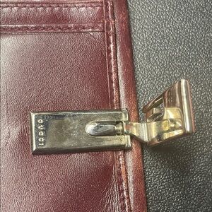 Sophisticated Gucci card holder in maroon leather. Features sleek metal accent. Perfect for stylish organization.