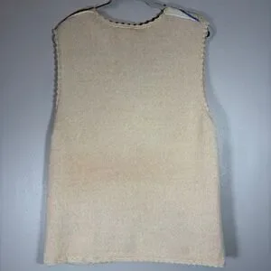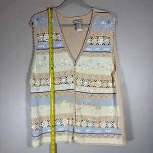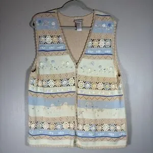Vintage Floral Crochet Knit Button Front Vest Tan Blue MK30V92 Large grandmacore