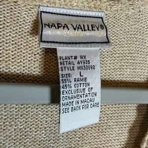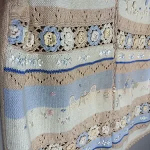 Vintage-inspired button-front sweater vest features a charming cottagecore aesthetic with intricate floral embroidery and crochet knit panels. Crafted from a breathable ramie and cotton blend, this lightweight piece showcases a soft palette of tan, blue, and cream with delicate garden-themed details including flowers and butterflies. The V-neckline and scalloped edges add a feminine touch to the structured silhouette, while the solid tan back provides a clean finish. Darker brown discoloration on back of sweater, pictured.