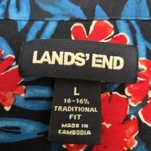 The Lands End Hawaiian Camp Shirt in size L is a vibrant and fun addition to any man's wardrobe. Made from a comfortable rayon and cotton blend fabric, this bright blue and red shirt features a classic fit with short sleeves and a button closure. The shirt is adorned with a floral pattern, giving it a Hawaiian theme perfect for casual wear. Lightweight and easy to wear, this shirt is a stylish choice for those looking to add a pop of color to their outfit. 🤩