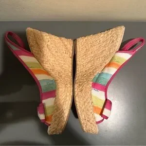 Step into style with these vibrant Coach wedge sandals. Featuring a colorful striped design, these shoes are perfect for adding a pop of color to any outfit. The comfortable wedge heel and slingback strap ensure a secure fit. Ideal for casual outings or a day at the beach.