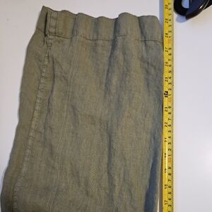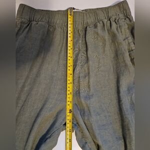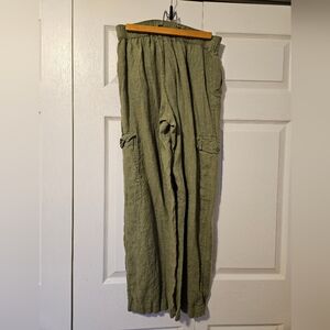 Soft sage linen light weight cargo pants. Elastic waistband for comfort and lots of pockets! so comfy you'll forget you have pants on!