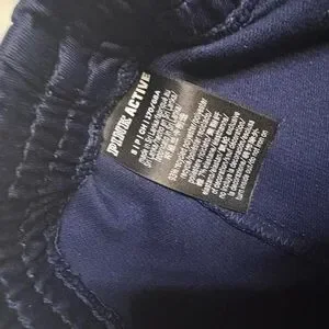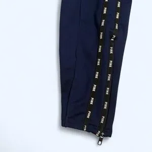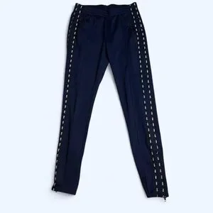 Stylish navy track pants. Features gold accent stripes. Comfortable fit. Perfect for casual wear.