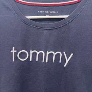Navy tee featuring 'Tommy' in white. Red and white trim detail.