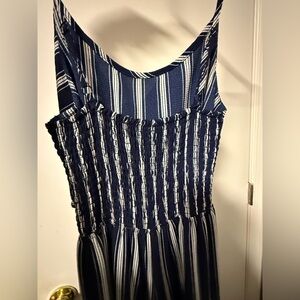 Stylish jumpsuit with navy and white stripes. Ideal for casual outings. Comfortable and trendy design.