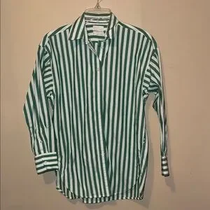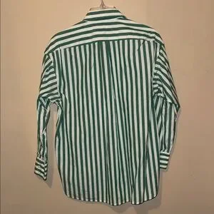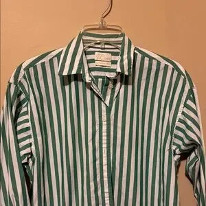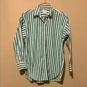 Stylish button-down with green and white stripes. Ideal for casual wear. Elegant design by J. Crew. Size 2 relaxed fit