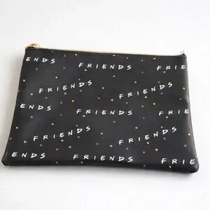 Black cosmetic bag with FRIENDS logo. Colorful dot accents add fun. Ideal for travel or daily use with your 80's Friends!