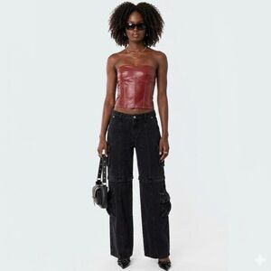 Edikted bundle, burgundy corset top, leopard print jeans, vegan leather corset, cheetah print baggy jeans, low rise animal print denim, contrast stitch corset, Moss corset top, snatched waist, strapless faux leather top, lace up back corset, aesthetic streetwear, Y2K fashion, 90s grunge revival, baddie outfit, night out set, festival clothing, structured boning, rigid denim, baggy fit pants, burgundy and leopard outfit, Curated Outfit Bundle.