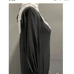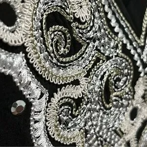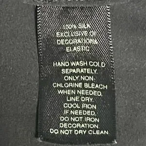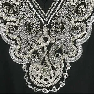 Market. Elastic at the wrists and hem and lovely white sparkly embroidery with some sparkly beads along the v-neck. Hand washable. Deep vee in front and back. Tie across the back keeps the top from slipping.