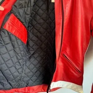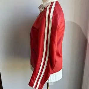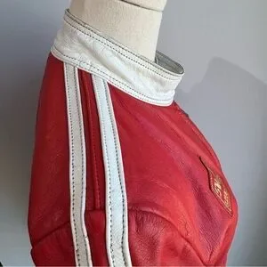 Rare British cafe racer leather jacket with bold racing stripes, structured red and white biker style, authentic late 70s/early 80s moto gear.