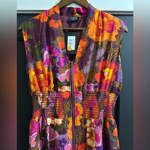 Vibrant floral midi dress with a mix of pink, orange, and purple hues. Features a flattering fit and eye-catching design. Padded shoulders with zip front closure.