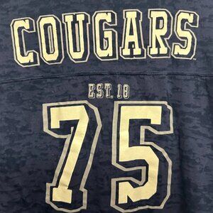 This cute tee is perfect for the season! Thin tee (see pics with my hand under fabric) is perfect with a tank underneath. BYU logo on front with #75 and Cougars on the back. No cracking in the print or arm bands. No stains, rips, or snags. Is a tight-fitting XL