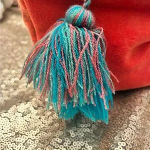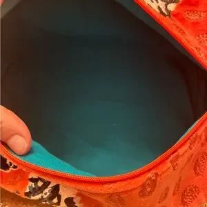 Vibrant orange cosmetic bag with intricate zebra embroidery and colorful tassel.