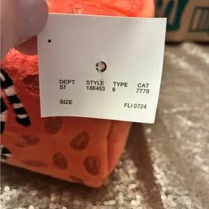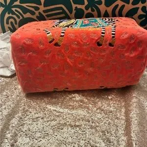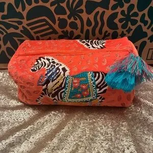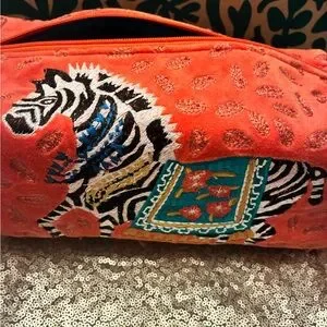 Large Embroidered Bright Orange Zebra Cosmetic Bag w Pom Pom Zipper NWT