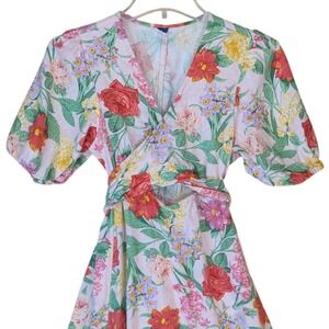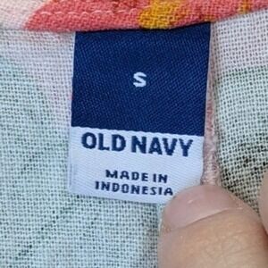 Old Navy floral maxi dress crafted from a breezy linen-rayon blend. This vibrant piece features a wrap-style bodice with a flattering V-neckline and short puff sleeves. The back showcases a charming tie-waist detail and a subtle cutout, adding a touch of modern flair to the classic A-line silhouette. Adorned with a lush botanical print of roses and wildflowers in shades of red, pink, and yellow against a light pink background, it's a perfect choice for garden parties or summer outings.