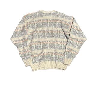 Elevate your wardrobe with this LG crewneck sweater. Features a geometric pattern in cream and gray. Ideal for casual wear.