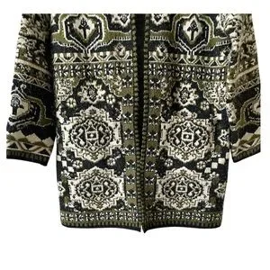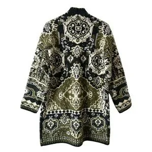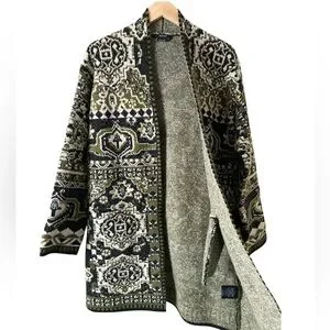 Stylish patterned long sweater coat. . It features a distinctive, intricate patterned knit in shades of olive green, black, and cream. Perfect for that classy look.