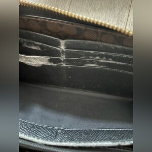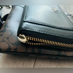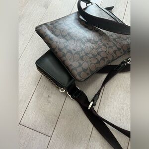 Elegant Coach messenger bag with signature pattern. Features brown and black tones. Ideal for daily use.