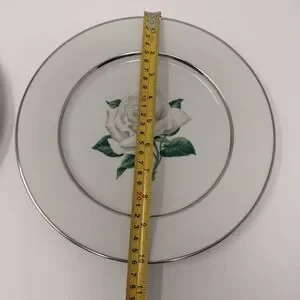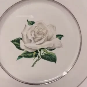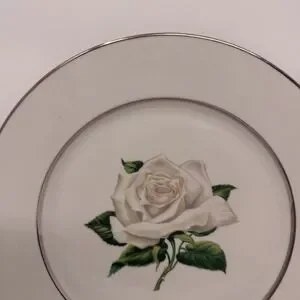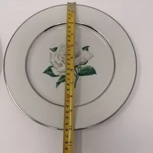 The product is a set of 2 Embassy Vitrified White Rose dinner plates, each measuring 10 1/8" in diameter. Made of porcelain, these white plates feature a elegant white rose pattern, perfect for adding a touch of sophistication to any dining table. The set includes two dinner plates, ideal for serving meals to family and guests in style.