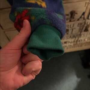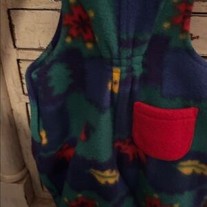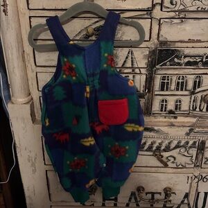 Fun and vibrant overalls with a playful red pocket. Features colorful patterns and adjustable button straps. Super soft overalls for a boy or girl with cuffed bottoms. It had side snaps along the hip and along the diaper area for easier changing. Two red pockets one on the front with an elk/moose and one on the back. Adorable and warm :) Size reads newborn but it’s more of a 3-6mon sizing.