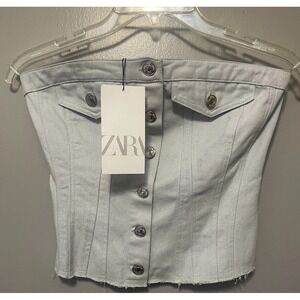 Zara Women's Buttoned Strapless Corset Top Denim Shiny Stretch Size S - NWT